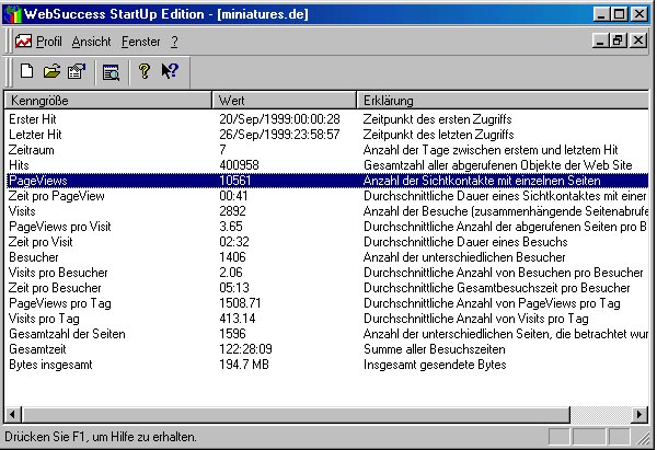 Die anderen statistischen Kenngrößen sind für den Betreiber der WebSite interessant, aber nicht immer objektiv zu bewerten. Zur genannten Anzahl der Besucher muss man beispielsweise wissen, dass hier nur unterschiedliche IP-Nummern der Besucher gezählt werden. Die Kunden der großen Online-Dienste wie AOL, T-Online, CompuServe oder Arcor, surfen jedoch mit einer IP-Nummer des nächstgelegenen Einwahlknotens, die dann für Hunderte oder Tausende von Besuchern identisch ausfällt. Demnach liegt die tatsächliche Zahl der verschiedenen Besucher der WebSite deutlich höher, WebSuccess kann dies aber nicht erfassen.