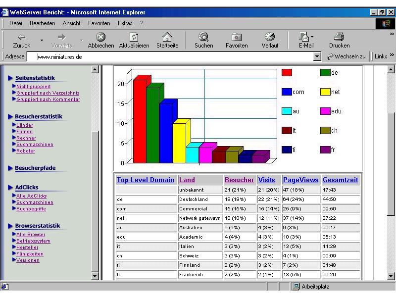 In der Länder-Statistik wird versucht, das Herkunftsland eines Besuchers zu bestimmen. Voraussetzung ist, dass im gewählten Profil die Funktion DNS-lookup eingestellt ist und jede mitgeschriebene IP-Nummer tatsächlich über den NameServer eines Zugangsproviders ins Herkunftsland zurückverfolgt werden kann. Diese Prozedur kann sehr lange Online-Zeiten erfordern, besonders bei umfangreichen Log-Dateien. Im vorliegenden Beispiel sind 19% der Besucher von Deutschland aus ins Internet gestartet, 21% konnten nicht identifiziert werden, 15% und 10% surften über .com- und .net-Adressen, die keinem Land zugeordnet sind, immerhin 4% surften von Schulen oder Universitäten aus, 4% starten von Australien, jeweils 3% von Italien und der Schweiz und je 2% von Finnland und Frankreich.