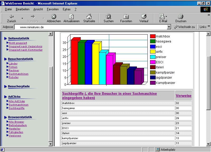 Erfolg im Internet hängt unmittelbar von der Qualität und Anzahl der verwendeten Begriffe ab. Viele Erstkontakte mit potentiellen Kunden kommen durch Suchmaschinen zustande. Dort spielt der sorgfältig gewählte Suchbegriff eine große Rolle. Im vorliegenden Beispiel haben wir es mit einer WebSite für Modellbauer zutun. Wer sich für das Thema interessiert, kennt vielleicht einen oder mehrere große Hersteller und Anbieter von Modellbausätzen und verwendet deshalb auch im Internet solche erfolgversprechenden Suchbegriffe wie „airfix“, „matchbox“, „hasegawa“, „esci“, „italeri“, „revell“ oder „faller“. Wer keinen Hersteller kennt, landet ebenfalls auf dieser WebSite, sobald generische Suchbegriffe wie „kettenschlepper“, „tanklöschfahrzeug“, „kartonmodellbau“ oder „kübelwagen“ anwendet werden. Um nun möglichst viele Besucher auf die eigenen Seiten zu lotsen, empfiehlt sich ein intensives Studium der Suchbegriffe, die bereits einen oder mehrere Kontakte vermittelt haben. Wenn, wie in diesem Beispiel, die Namen von Herstellern überwiegend für Kontakte verantwortlich sind, sollten weitere Seiten der Internet-Präsenz dieses Thema aufgreifen und im Detail über Hersteller und deren Produkte berichten. Auf diese Weise werden die Suchmaschinen zunehmend mit geeigneten Seiten bedient und die Zahl der erfolgreichen Kontakte mit Interessenten wird steigen.